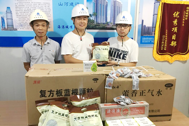 公司代表分别前往各在建项目,为大家送上板蓝根、藿香正气水、清凉油等防暑降温药品,保证每一位现场施工工人安全度夏。同时,公司代表带去了领导的关心和嘱托,对一线人员战高温、斗酷暑、保生产给予了高度肯定,嘱咐大家在夏季工作中要注意防暑降温,在确保个人安全的前提下做好安全生产。