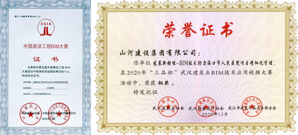 近日,由山河建设集团海南公司申报的《发展新动能-BIM技术助力海口市人民医院项目精细化管理》成果在第五届中国建设工程BIM大赛中荣获三类成果。此外,该成果在2020年“三品杯”武汉建筑业BIM技术应用视频大赛活动中荣获铜奖。