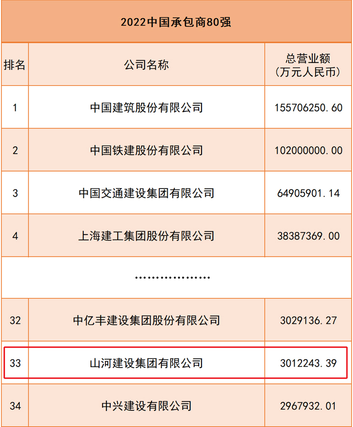 会上公布的“中国承包商80强”榜单上,山河建设集团名列第33位。2022年度“中国承包商80强”以2021年度企业工程承包营业收入作为主要排名依据,展示了新一届中国建筑业行业领军者的风采。